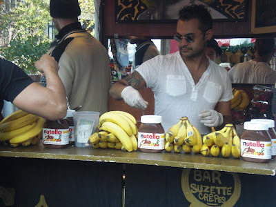 The Holiday Market in Union Square is officially open...I ran threw very quickly yesterday...the guy in the white short sleeve shirt below (yeah, it was a beautiful 65 degrees in NYC yesterday and looks like more of the same today) has a booth making crepe Suzettes...I didn't try it...but, he did inspire my breakfast this morning...nutella, bananas and green tea...YUM! Mini woke up late with just 15 minutes to get dressed and get on the school bus...so no yumminess for her...from the looks of our nutella jar, Miss Mini has been sneaking this stuff by the spoonful...smile.
