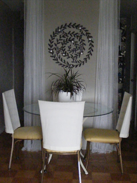 So...I was watching the Rachel Ray Show yesterday...something I never do...but, she had these twin decorators on and they covered an entire wall with laminate wood flooring...and that got me thinking...hum...I should try that on my dining area wall...(see below). I know IKEA sells really nice laminate flooring...and it is near the hospital...and Mini is doing so well that I may sneak off for a couple of hours after this snow storms passes us by tonight...