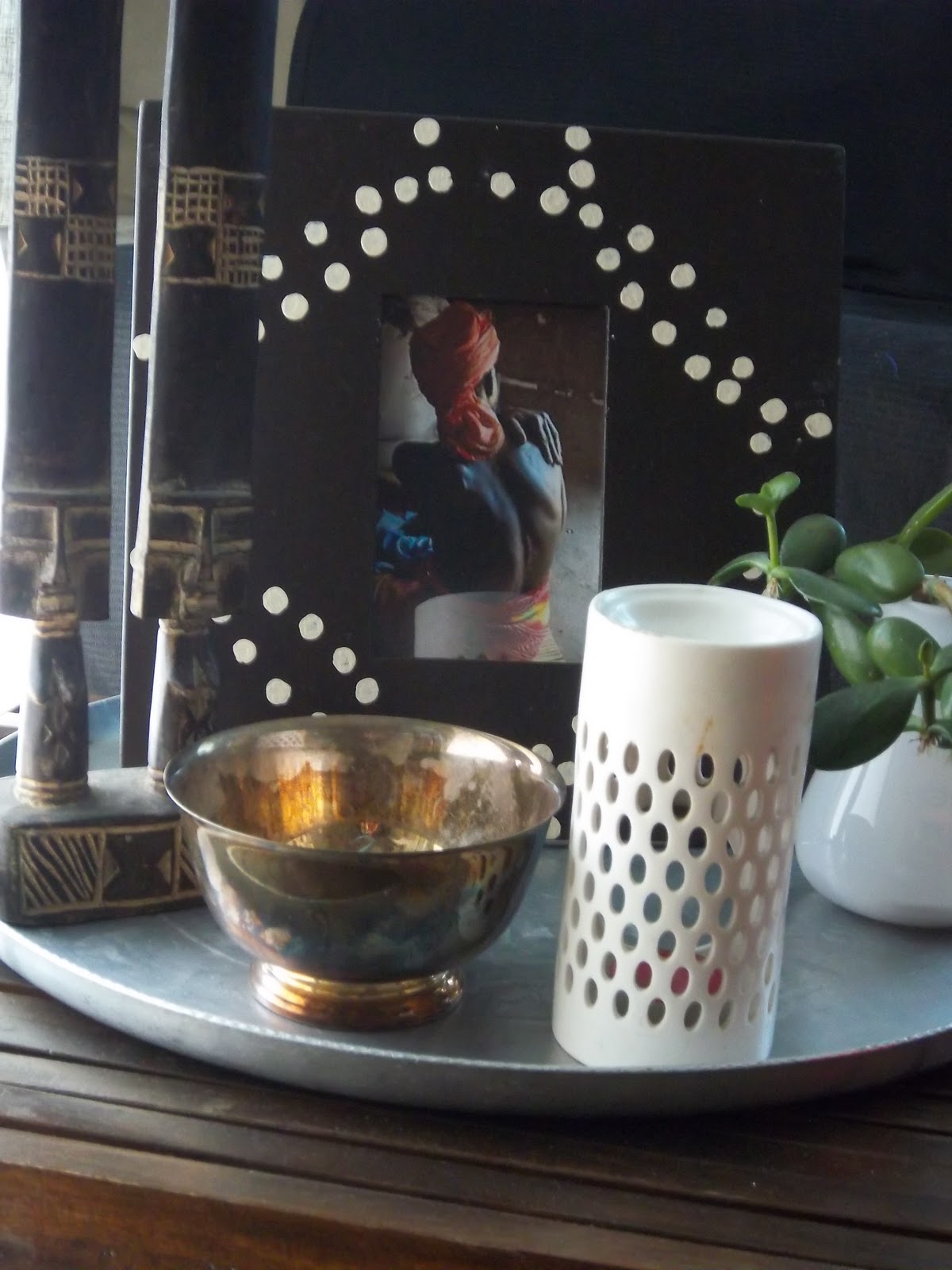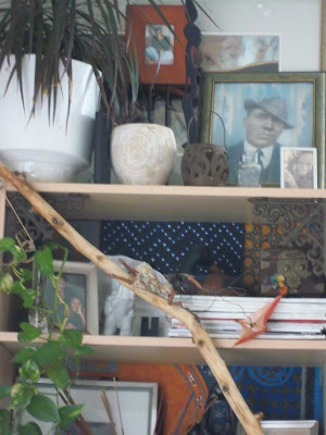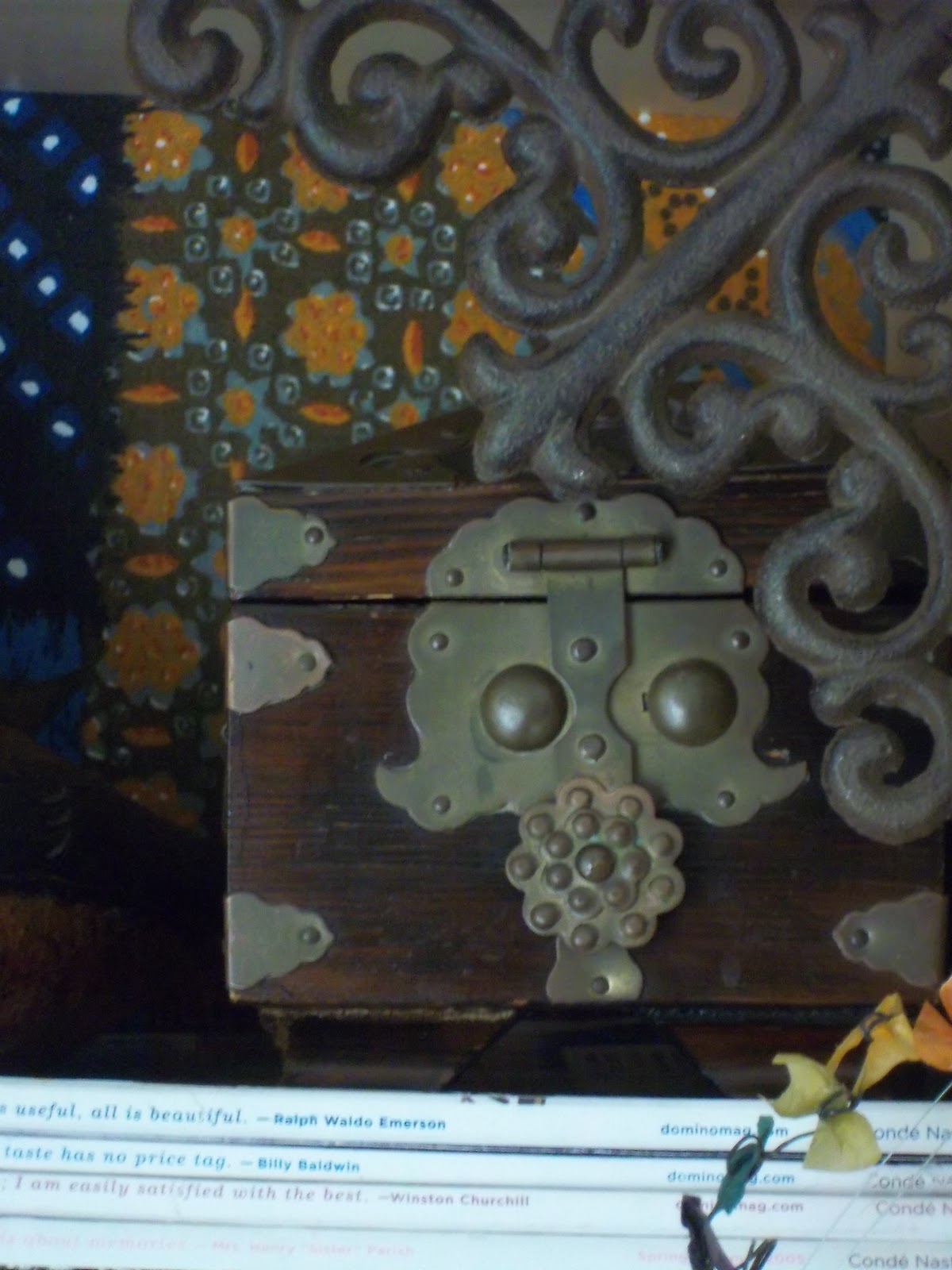 ...jade plant on thrifted hammered steel tray...an old asian box...bought that before Mini, so I have no idea where I found it. The iron shelving bracket in the corner is from a recent trip to Brimfield.
