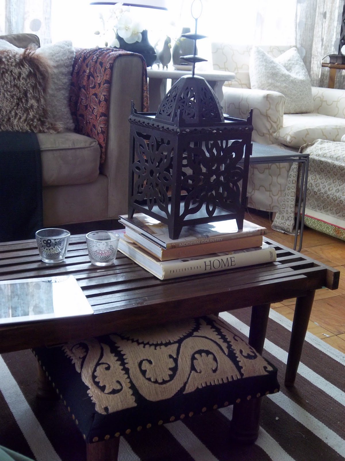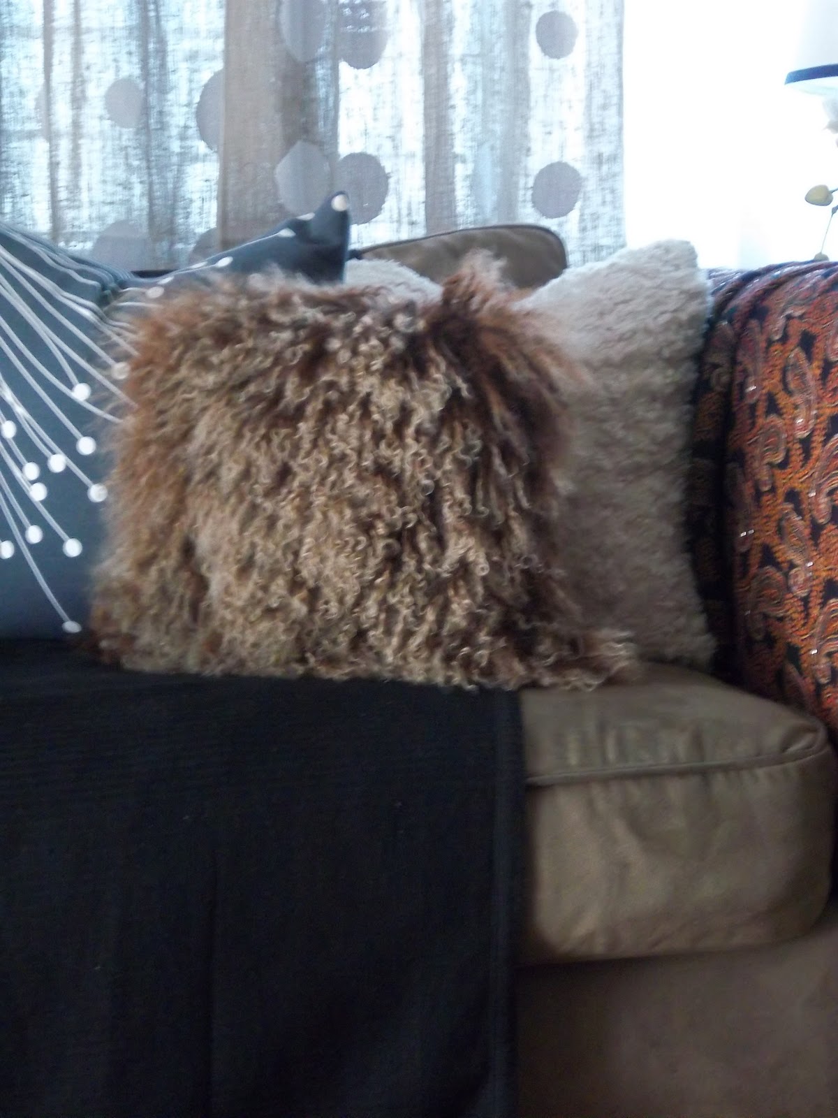 ...my nemesis...the couch...it's still here...the pillows and thrifted throw make it pretty.