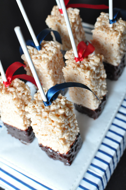 The whole process is super simple, just make rice crispy treats (directions on the box), cut into 1″ x 1″ x 3″ rectangles, add a candy stick, dip in melted chocolate and enjoy! You could easily add sprinkles and wrap them in cellophane for portability too.