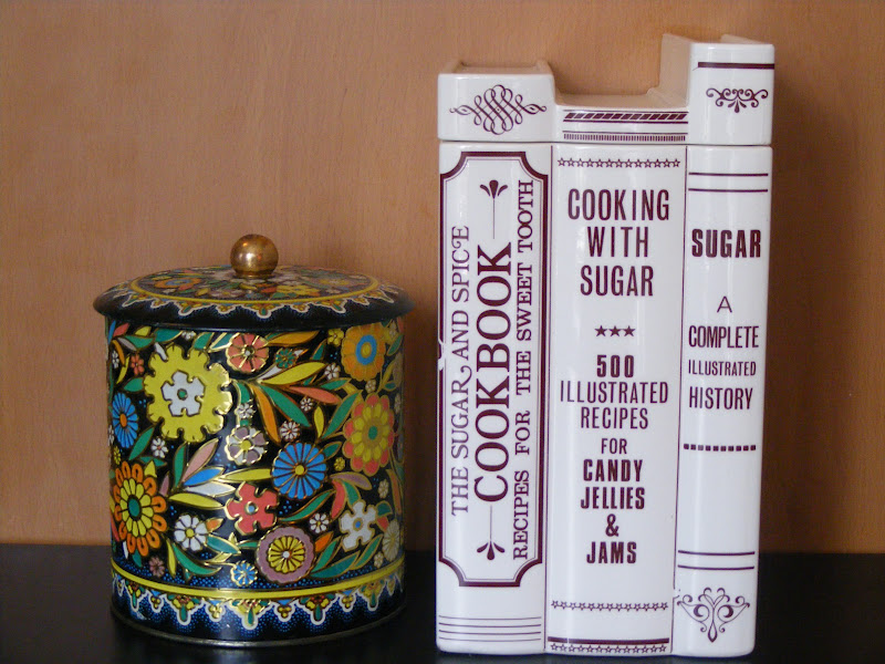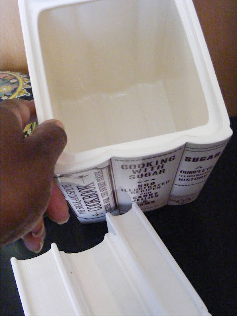 ...picked these puppies up during last weeks thrifting adventure. The tin candy can is soooo pretty...the cookbooks...or faux-cookbooks are actually kitchen canisters...there were 3 other pieces to the set...but, an old lady snatched the other two...and I don't fight old ladies...