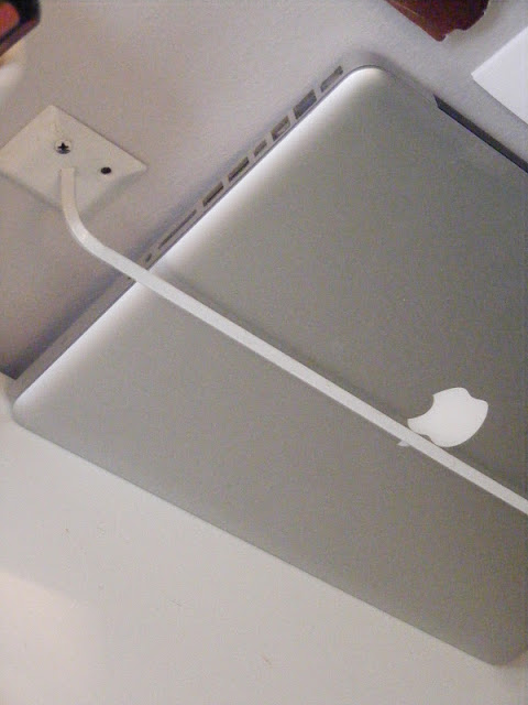 I copied this little trick from the IKEA catalog...it's great for freeing up desk space when the computer is charging...It's a regular towel bar from the dollar store.