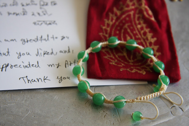 I got this beaded jade bracelet from an artist in India...The idea of that just makes me smile.
