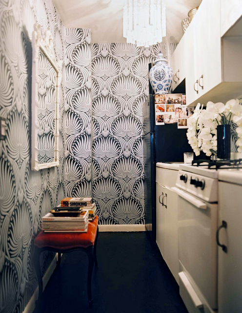 ...small kitchen, big style...just splash a bold printed wallpaper all over...paint the floor black...Done.