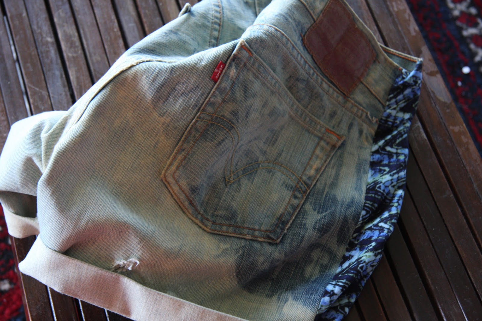 ...they were a little too tight for a mom of a certain age...so I decided to try a little DIYon them...first I dipped the jeans in bleach...that whitened the bottom...then I wrapped the jeans in rubber bands and quickly dipped the entire shorts into the bleach...they came out with this great batik pattern on top...love.